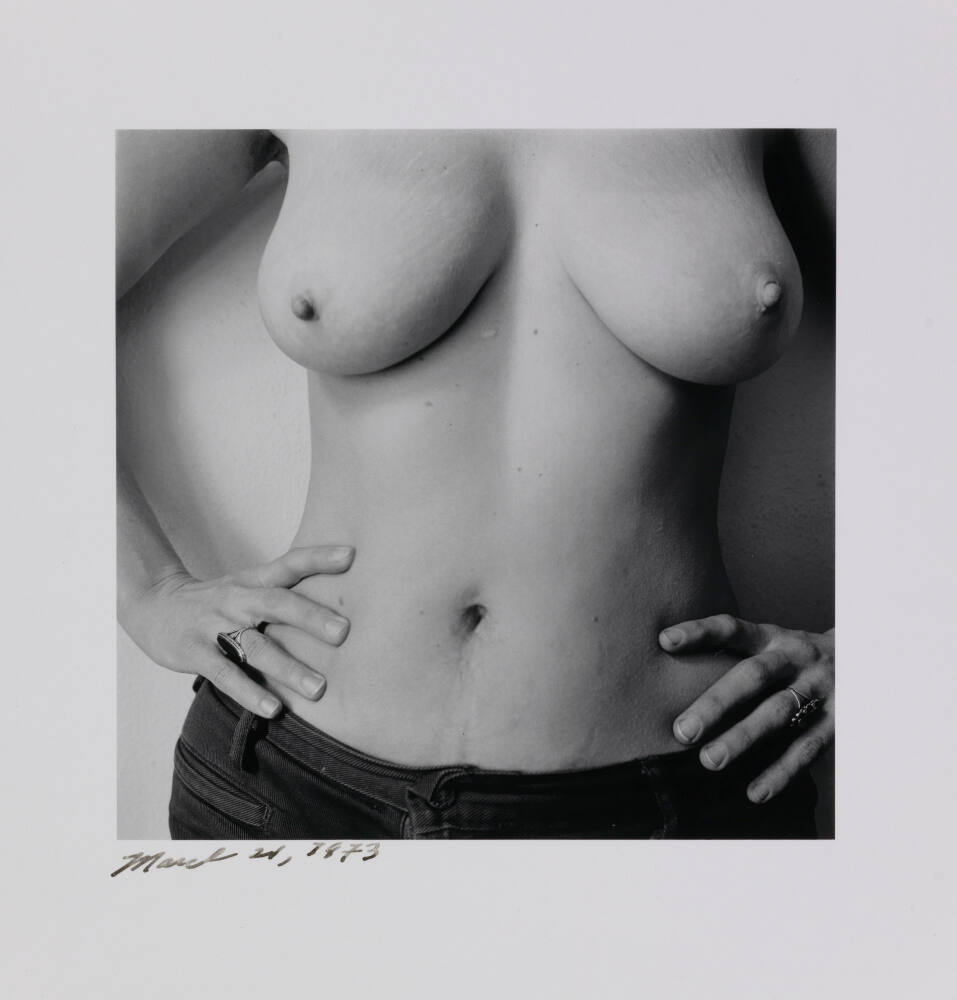 DescriptionSelf-portrait of topless woman's torso with hands on hips.
