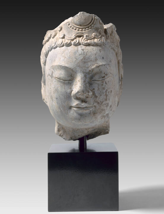 DescriptionLimestone head of a Bodhisattva finely carved with arched brows, elongated eyes, broad nose and full lips. The back part of the head is partly missing. The hair is arranged in regular curls, coiling to each side from the center, in a line along the forehead and in front of the ears. It wears the remains of an elaborate diadem of three parts, the central section carved with a large jewel in front - held in place by a strap or ribbon, a fragment of which remains behind the head.Exhibition HistoryChinese Buddhist Sculpture, Eskenazi Ltd. Oriental Art, London, England, June 1997, no. 5.