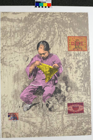 DescriptionA young girl is depicted sitting before a background of a traditional Chinese mountainscape. In "Rice Bowl II", the girl is dressed in pink and is opening a fan in yellow. The print has three or four stamps collaged onto the paper, one states "Rice Bowl Brand Made in China" (the stamps are different paper covers used for matches).