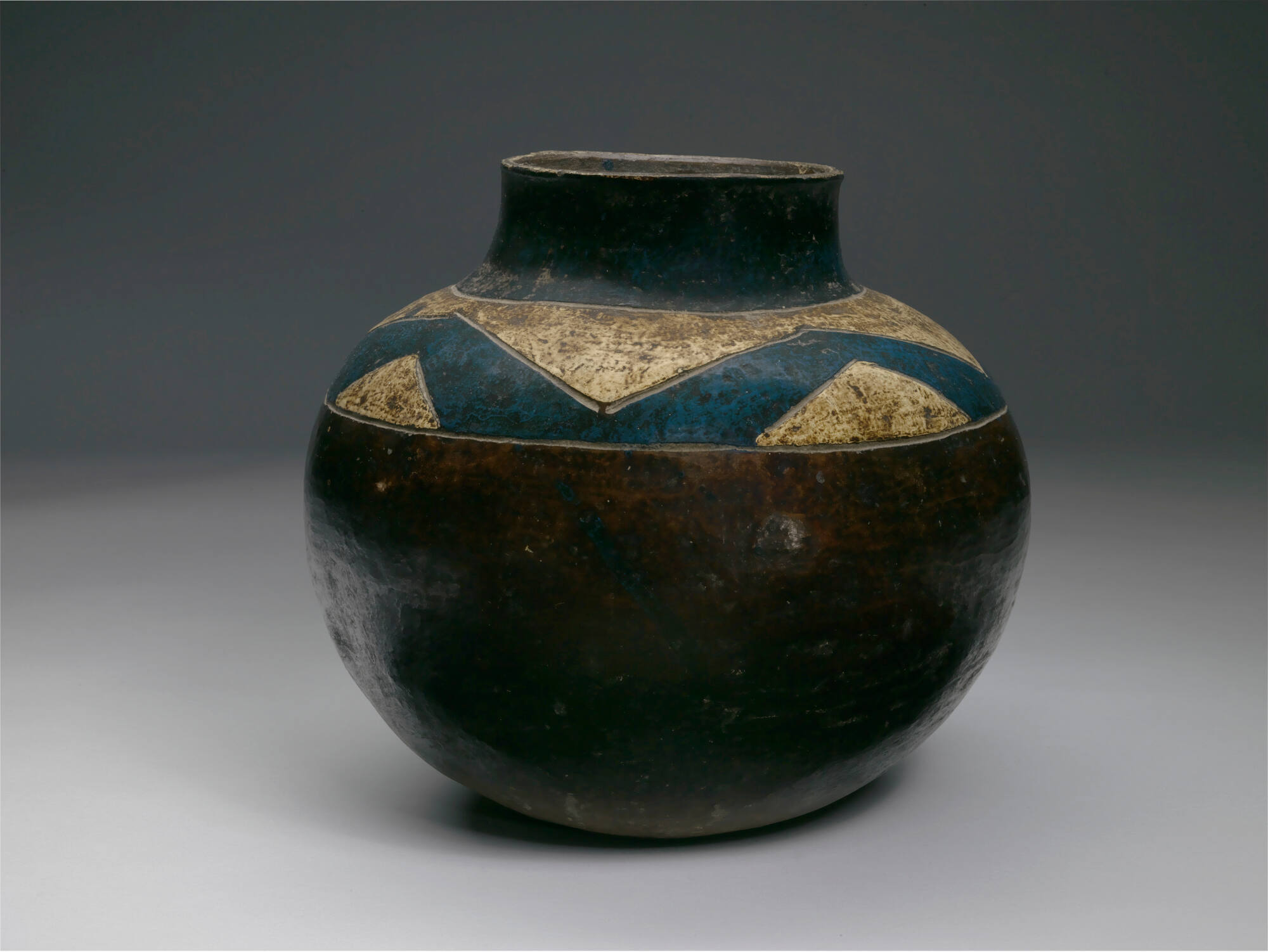 DescriptionThe body of this ceramic vessel is dark red in color while the shoulder exhibits black and white colored areas delineated by wide incised lines; the neck is black. The surface of the vessel is bumpy and irregular, probably from being hand-made.ProvenanceWith Mousse Sylla, by April 2002;