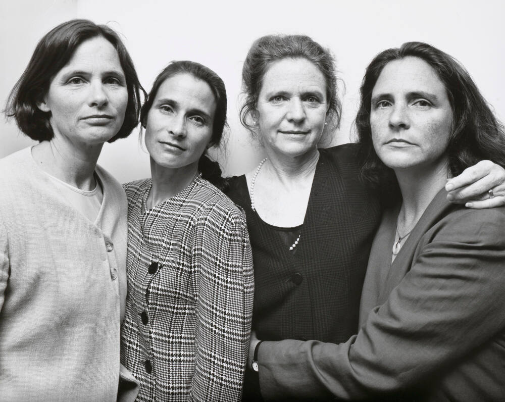 DescriptionPortrait of four sisters wearing formal jackets. They are standing close to one another in front of a neutral background.Copyright© Nicholas Nixon
