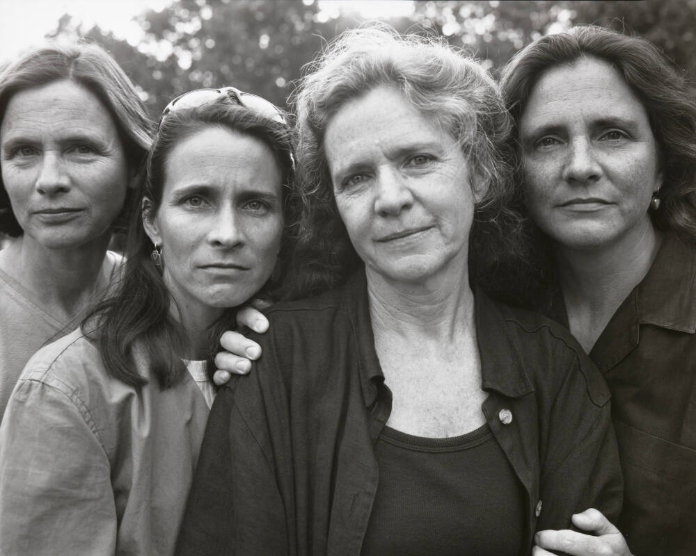 DescriptionClosely cropped portrait of four sisters. Mimi, second from left, is wearing sunglasses on top of her head. Bebe, second from right, tilts her head and slightly smiles. Sun shines through the leaves on the trees behind creating a sparkling effect.Copyright© Nicholas Nixon