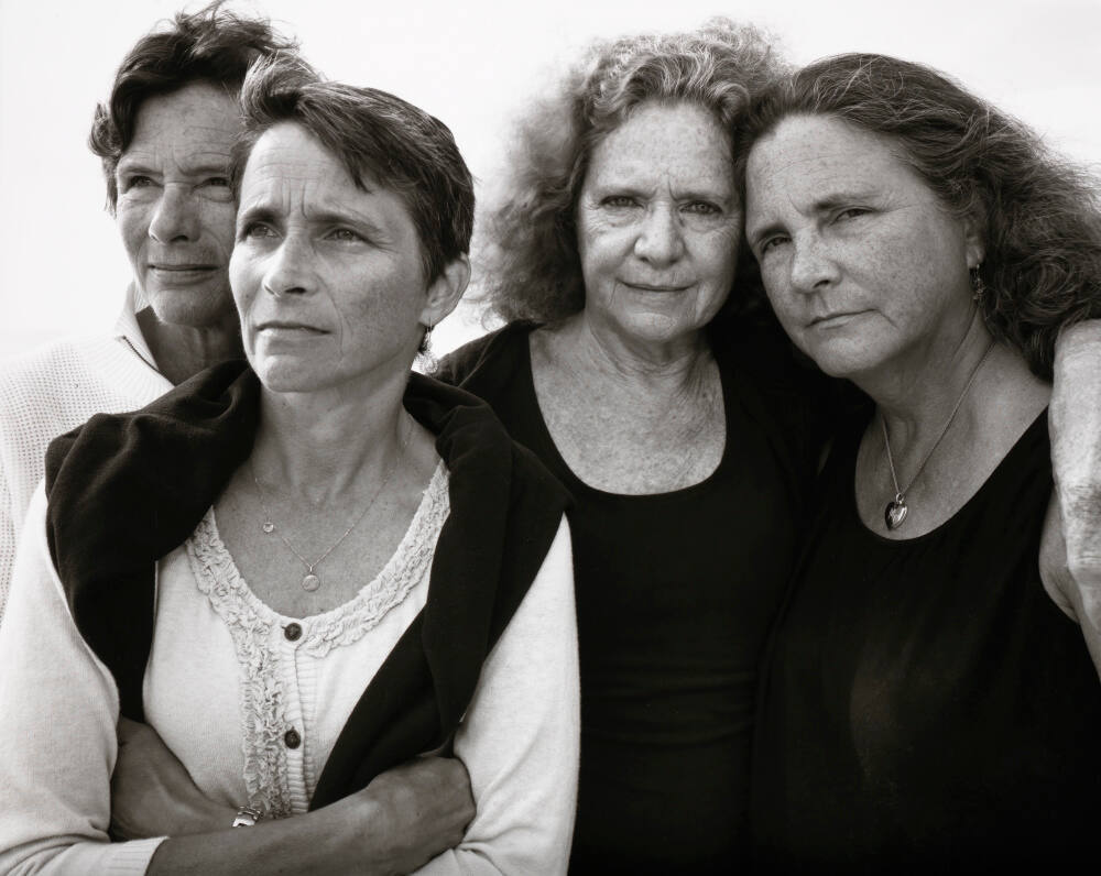 DescriptionPortrait of four sisters. The two on the right, Bebe and Laurie, have their arms around one another and are looking directly into the camera while the other two, Heather and Mimi, are looking off to their right.Copyright© Nicholas Nixon