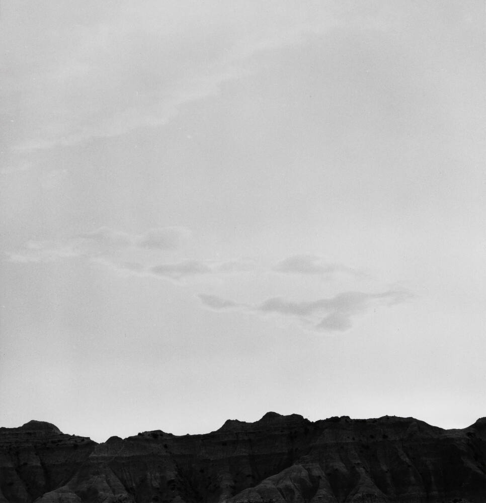 DescriptionImage of a section of badlands (at very bottom of frame) set against sky with scattered clouds.Copyright© David Plowden