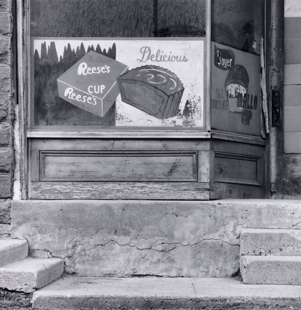 DescriptionImage of Reese's Peanut Butter Cup advertisement painted on window of candy store.Copyright© David Plowden