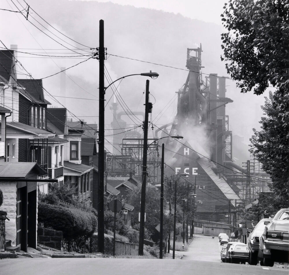 DescriptionImage of residentail road lined with street lights and power lines. There are houses along the left, parked cars along the right, and blast furnaces at the bottom of the hill.Copyright© David Plowden