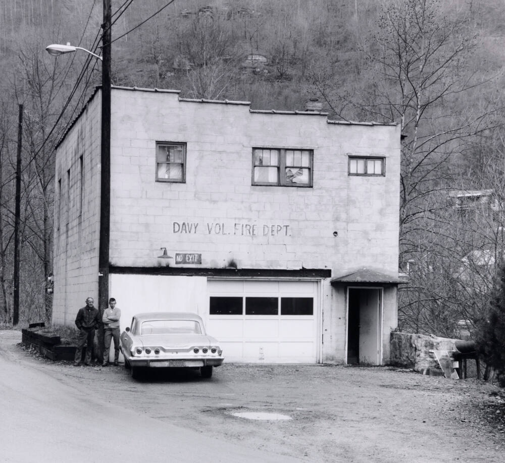 DescriptionImage of two men standing next to building identified as the Davy Volunteer Fire Department. There is a car parked in the gravel lot out front.Copyright© David Plowden