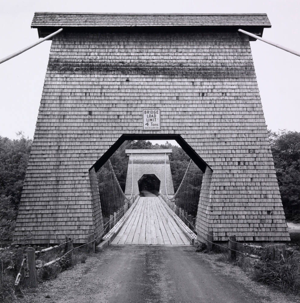 DescriptionImage of bridge with large entrance towers constructed of timber framing and covered with cedar shingles.Copyright© David Plowden