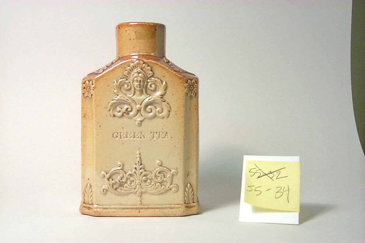 DescriptionOblong bottle-like form with four salient corner panels: decorated on front and back with classical motifs in relief; impressed "Green Tea" on center, front. Brown at top, shading downward into light gray-yellow.