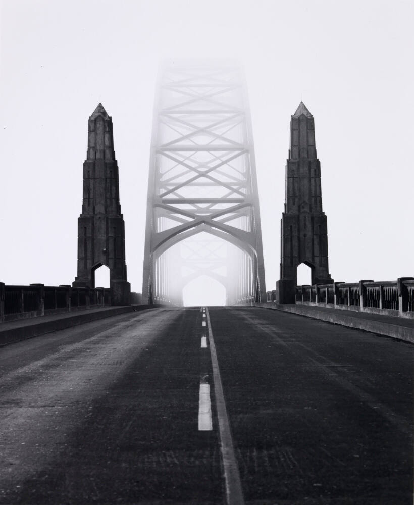 DescriptionImage of bridge with two tall obelisk-like concrete finials on either side of arch which disappears into the sky.Copyright© David Plowden