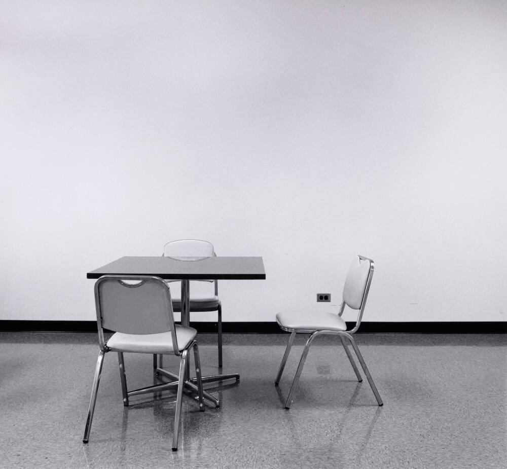 DescriptionImage of small square table and three chairs in middle of non-descript room.Copyright© David Plowden
