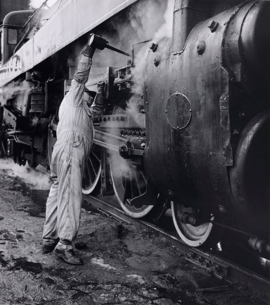 DescriptionImage of engineer working on locomotive emitting steam.Copyright© David Plowden