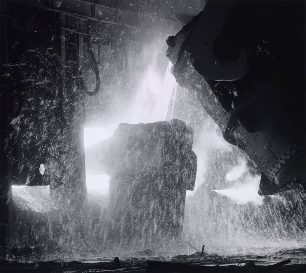 DescriptionImage of steel mill with furnace tipping to pour metal; tiny shards surround the space resembling rain.Copyright© David Plowden