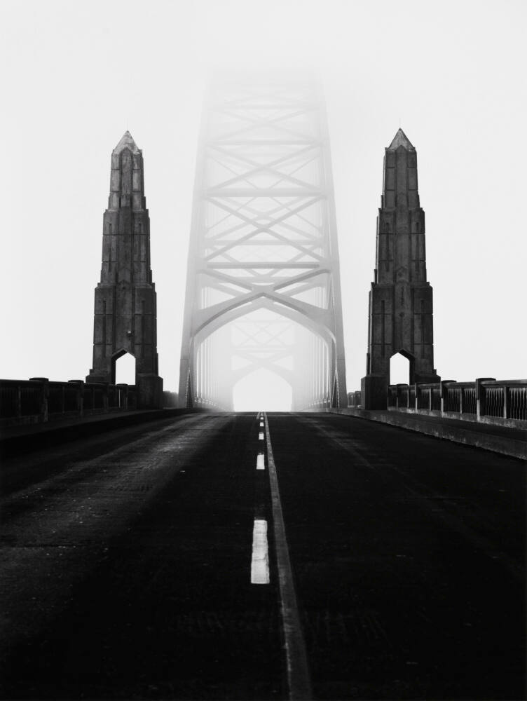 DescriptionImage of road leading up the arch bridge emerging from fog; the main arch is marked by tall obelisk-like concrete finials flanking either side above the walkways.Copyright© David Plowden