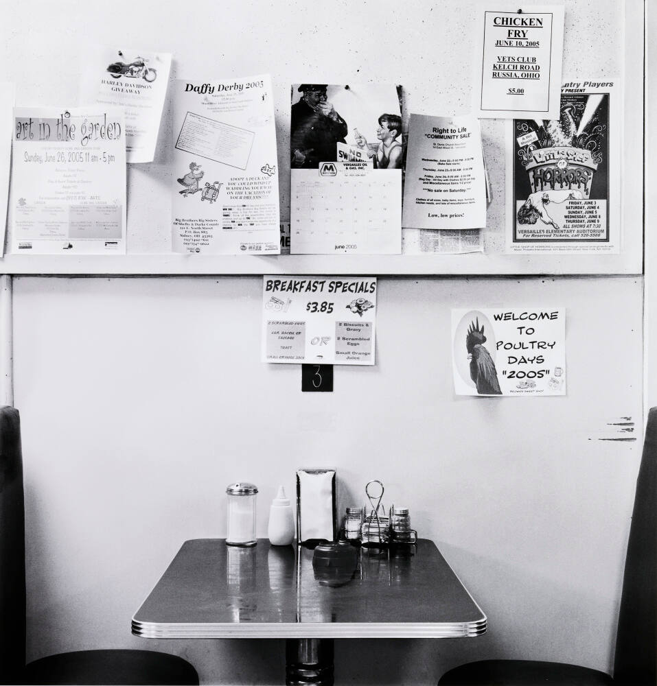 DescriptionImage of a cafe booth with calendar and flyers taped to wall nearby.Copyright© David Plowden