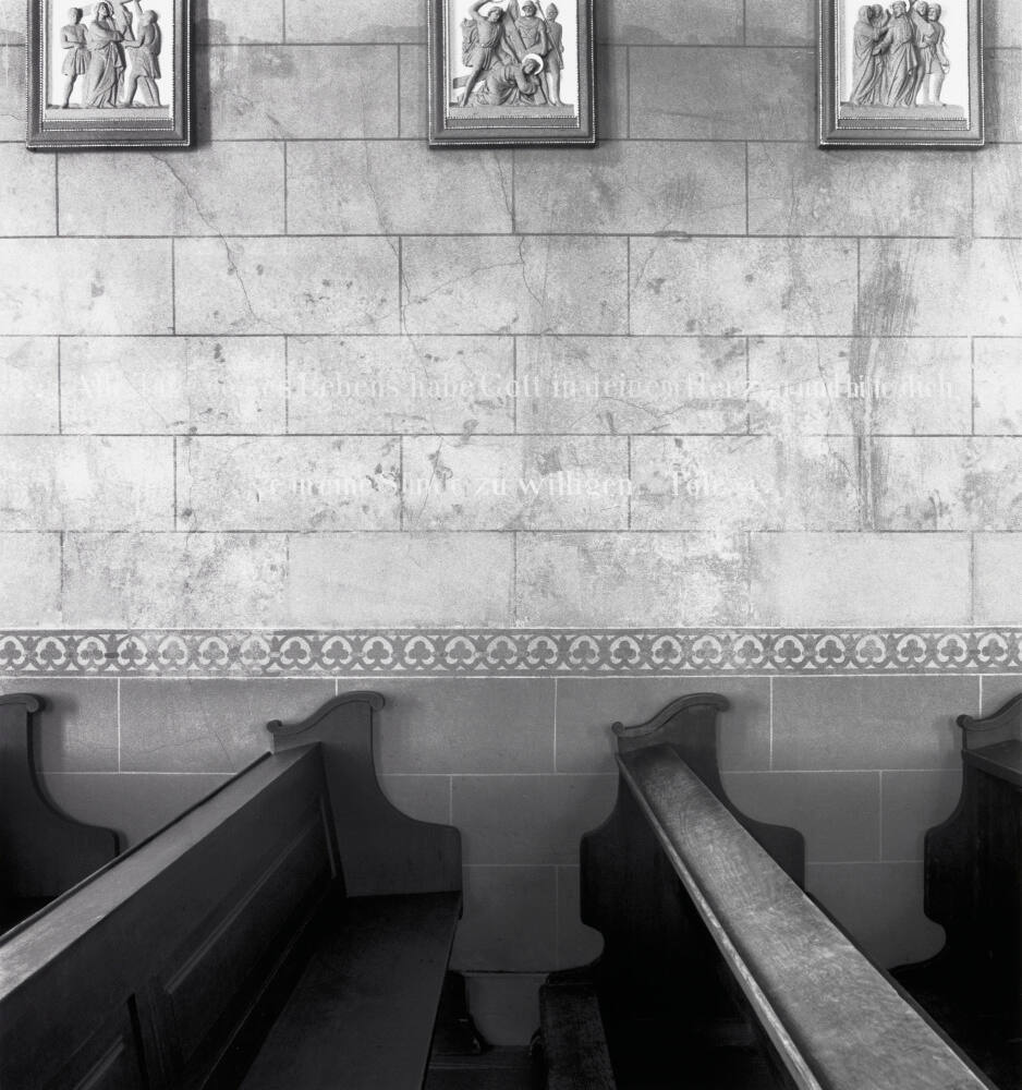 DescriptionImage of church pews and three framed images of Christ's crucifixion hanging above German text etched into wall.Copyright© David Plowden