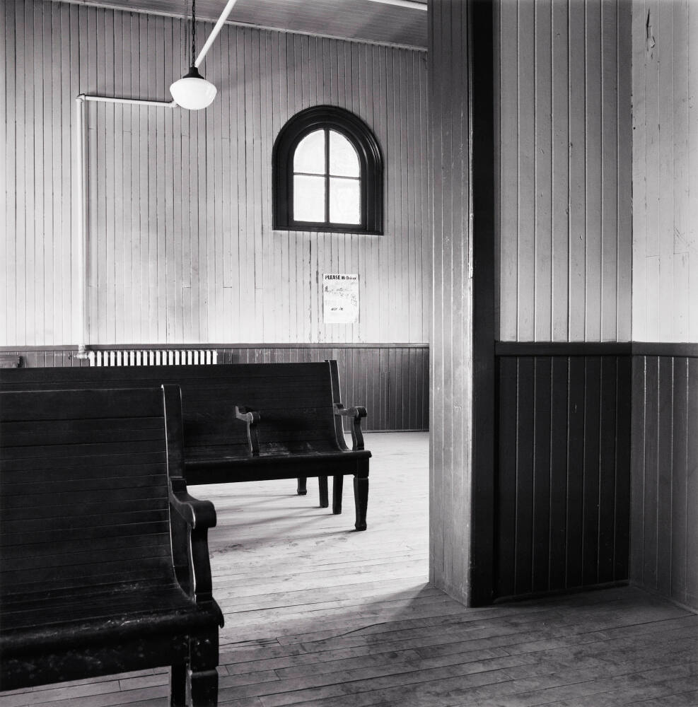 DescriptionInterior image of room with two wooden benches, wainscoted walls, wood floors, a schoolhouse pendant, and an arched window. Light streaming in from right just past wall.Copyright© David Plowden