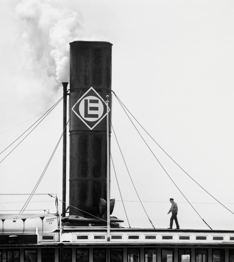 DescriptionImage of man wearing captain's hat, jacket, and pants walking along top of ferryboat towards the smokestack which displays a large letter "E". There are metal cables attaching the vessel to the ferry and steam rising from within.Copyright© David Plowden