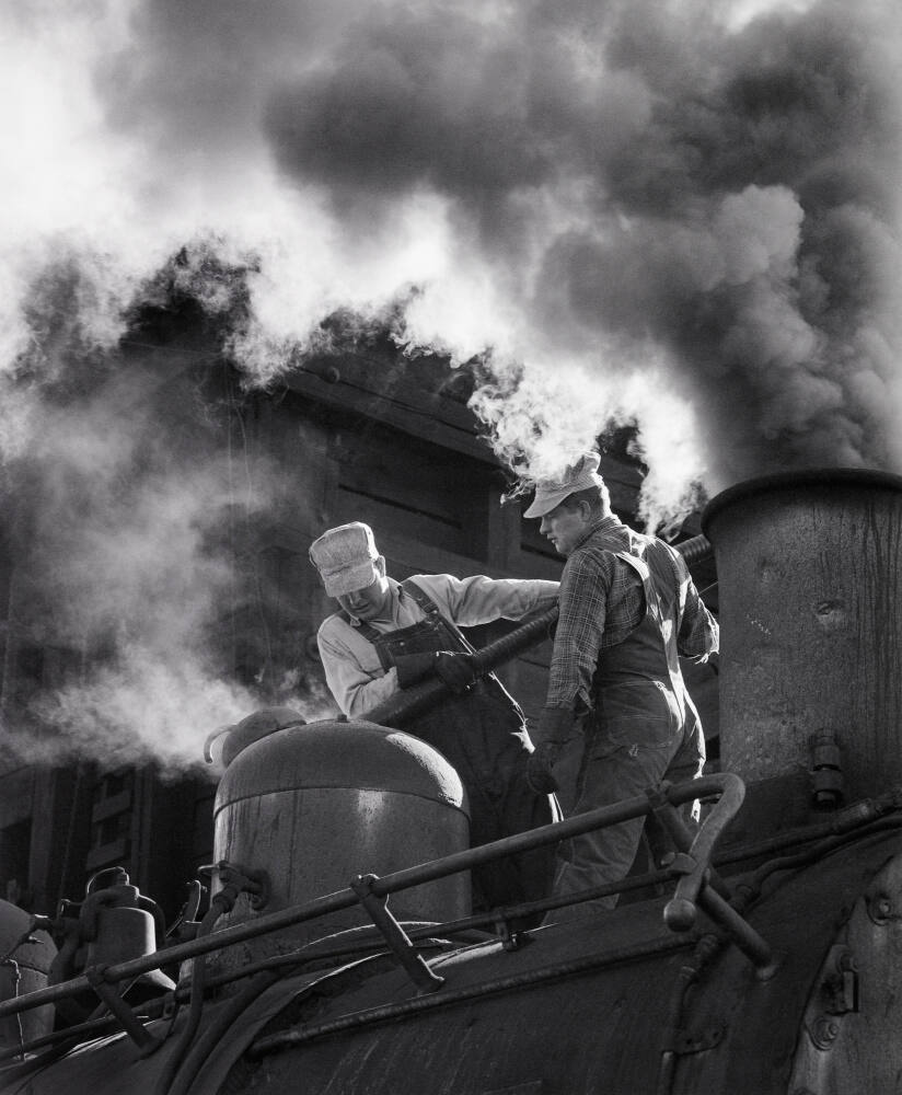 DescriptionImage of two engineers in overalls and hats working on top of a locomotive with steam coming out nearby and filling the sky.Copyright© David Plowden
