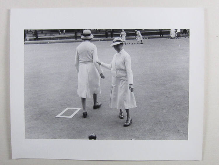 DescriptionImage of two older ladies wearing matching outfits with hats. One lady is walking away and the other is grabbing her arm and smiling. There are others in the background that appear to be playing Bocce.Copyright© Bruce Davidson/Magnum Photos