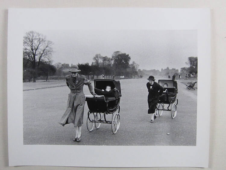 DescriptionImage of two governesses dressed in long coats and hats pulling baby carriages along a wide paved pathway. The babies' faces peek out through an opening in the carriage and there is a park bench nearby.Copyright© Bruce Davidson/Magnum Photos