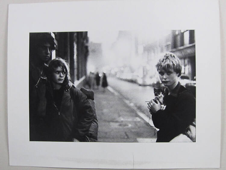 DescriptionImage of couple standing on sidewalk. The young man has his arm around the girl who is wearing a winter coat and carrying a rolled-up sleeping bag over her shoulder. She's looking suspiciously at a boy nearby who is holding a kitten.Copyright© Bruce Davidson/Magnum Photos