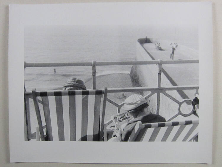 DescriptionImage of elderly woman reading article with headline "I LOVE A PHANTOM" while seated in striped chair (next to others) along railing which overlooks the water.Copyright© Bruce Davidson/Magnum Photos