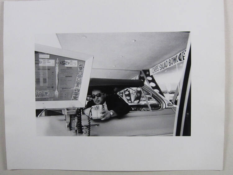 DescriptionImage of man wearing suit and tie with sunglasses leaning out of car window to order from a drive-in cafe while holding the intercom.Copyright© Bruce Davidson/Magnum Photos