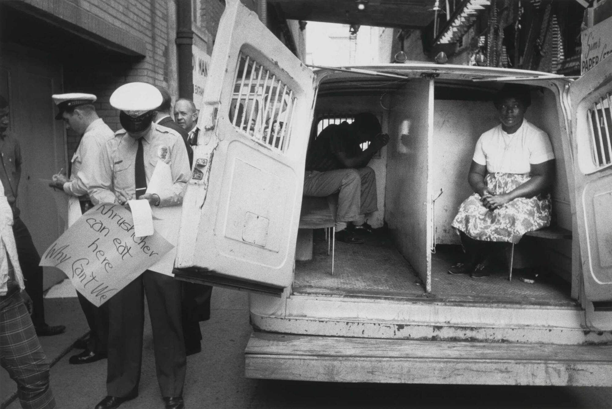 DescriptionImage of African American man and woman seated in back of police van with barred windows while police officer holds their protest sign and writes ticket.Copyright© Bruce Davidson/Magnum Photos