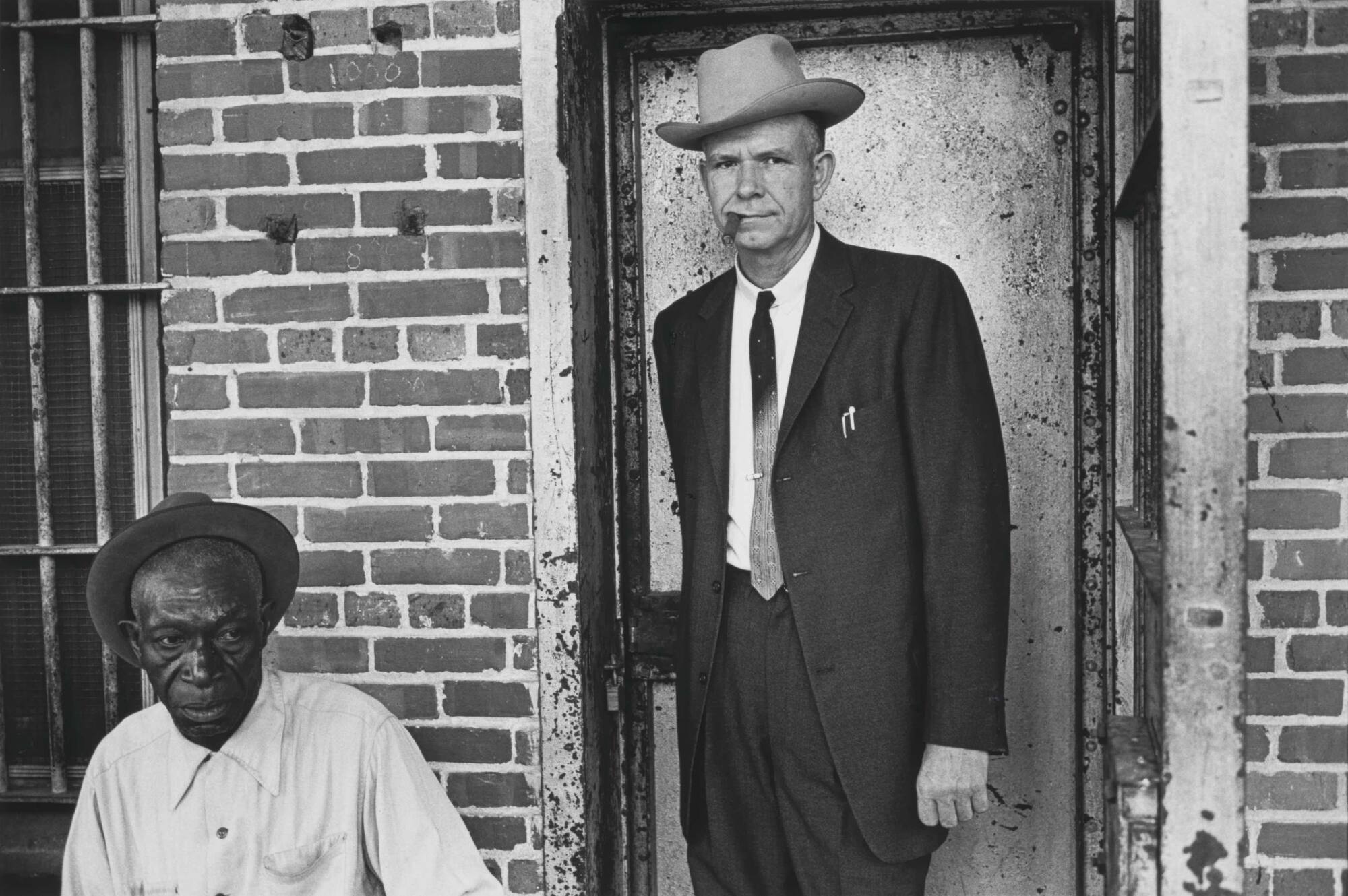 DescriptionImage of Caucasian man wearing suit and hat while smoking cigar. He's standing next to an African American man who is seated against a brick wall and wearing a hat with a buttoned-up shirt.Copyright© Bruce Davidson/Magnum Photos