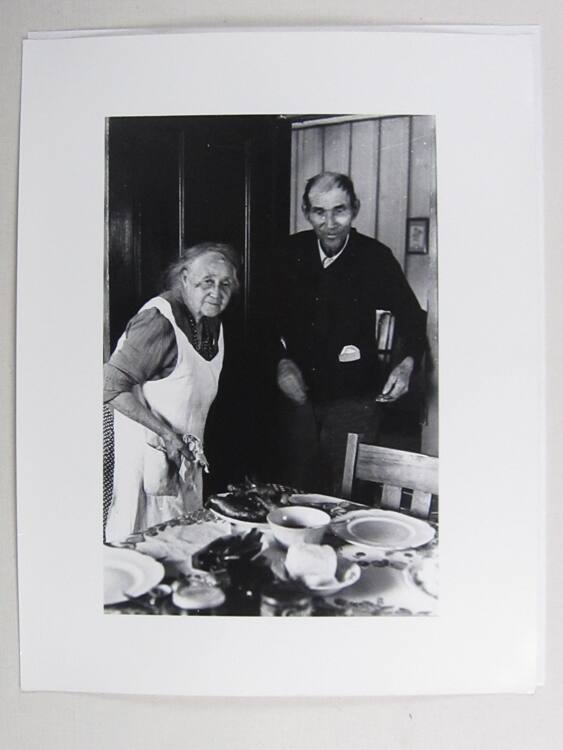 DescriptionImage of an old couple standing near the dinner table. She's wearing an apron and holding a rag and he's got silverware in his hand.Copyright© Bruce Davidson/Magnum Photos