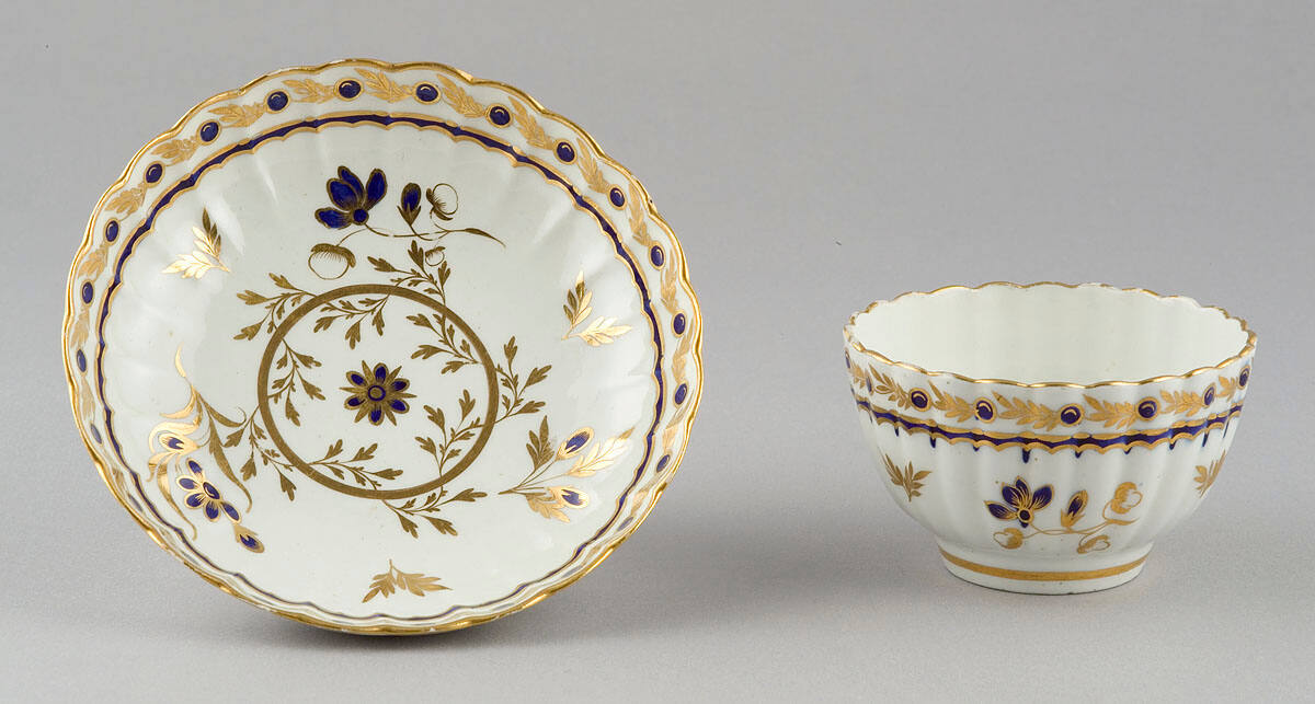DescriptionCup: without handle; white porcelain with fluted sides decorated with single flower and leaf designs in gold and blue, and continuous leaf pattern around top. Saucer: white porcelain with fluted sides, decorated on inside with single flower and leaf patterns in gold and blue; continuous leaf pattern around edge.ProvenanceMargaret Cameron Chapman (née Mann, 1865-1935), Kansas City, MO, by 1935;