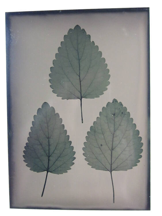 DescriptionDryplate tintype. Image of three lemon balm leaves next to one another in triangular pattern. Veins and stems are dark and contrast with leaves which have a slight greenish tint.Copyright© Larry Gawel