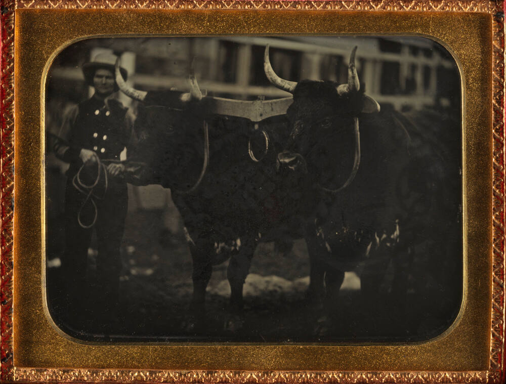 DescriptionImage of dover wearing hat and vest with shiny buttons standing beside two yoked oxen. This quarter plate daguerreotype is housed in a brass mat with rounded corners inside of a brown leather-covered case with an embossed red velvet liner.