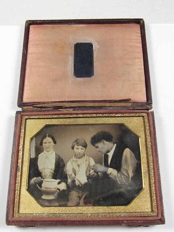 DescriptionQuarter plate hand-colored cased daguerreotype housed in octagonal brass mat with pink silk liner and etched plate. Genre scene of woman holding a ceramic pitcher, man wearing vest looking down whilst pouring from a small pitcher, and young boy seated between them holding a glass in one hand.