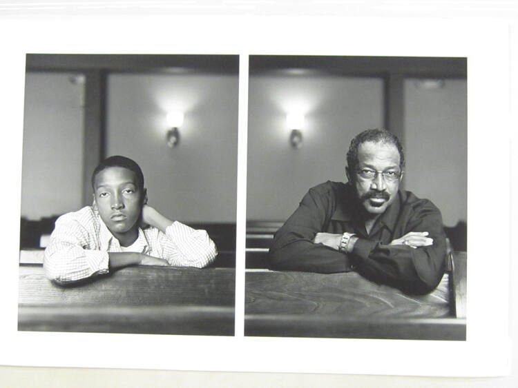 DescriptionDiptych portraits of two African Americans. The young man on the left is wearing a collared shirt and leaning over a church pew with one hand behind his neck. The older man on the right has a mustache and glasses and is wearing a dark collared shirt; he's leaning over a church pew with arms crossed.Copyright© Dawoud Bey