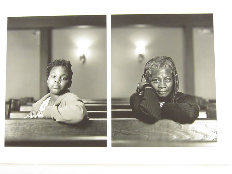 DescriptionDiptych portraits of two African Americans. The young girl on the left has curly hair and pursed lips; she's sitting to the side while resting one arm on the back of a church pew and crossing her hands. The older woman on the right is facing forward and has braided hair with arms folded near her chest while resting on back of pew.Copyright© Dawoud Bey
