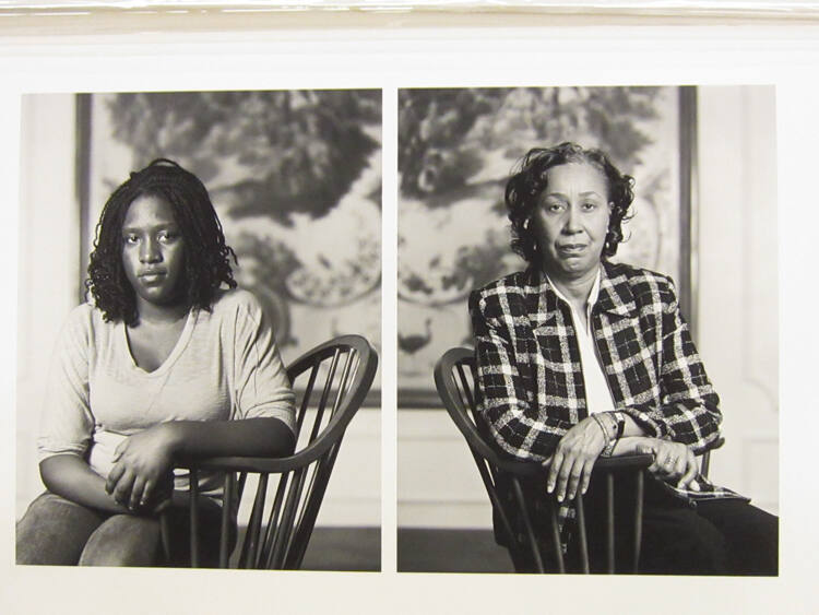 DescriptionDiptych portraits of two African Americans. The young woman on the left is seated in a wooden arm chair; she's wearing a V-neck shirt and her hair is in tiny braids. The older woman on the right is seated in an arm chair with her hands crossed at the wrist; she's wearing a patterned jacket, bracelets, watch, and earrings. There is framed artwork in the background.Copyright© Dawoud Bey