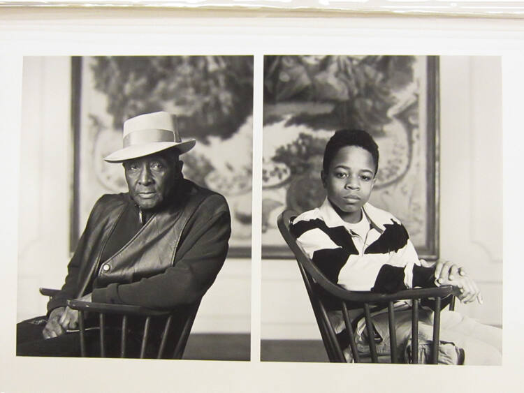 DescriptionDiptych portraits of two African Americans. The older man on the left is seated in a wooden arm chair; he's wearing a leather vest and banded hat. The young boy on the right is seated in a wooden arm chair with hands crossed; he's wearing a striped shirt and cargo pants. There is framed artwork in the background.Copyright© Dawoud Bey