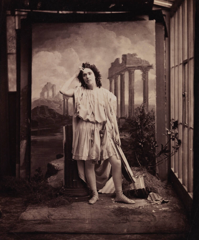 Posing against a painted backdrop, the costumed Rosa Csillag (1832–1892) enacts her role as ancient Greek mythological character Orpheus from the opera Orfeo ed Euridice. While Orpheus is male, in the opera, the role was often performed by women. Details from Camille Silvy’s studio, such as large windows and a painted backdrop with its edges visible, reveal the studio’s carefully constructed artifice. Such details would have been cropped out before the final images were sold to the public or used by the performer for self-promotion.