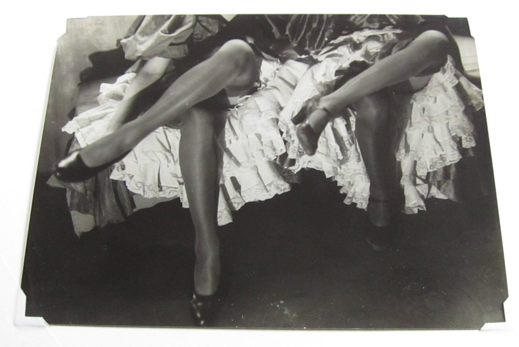 DescriptionImage of two French cancan dancers seated with legs crossed; the image is cropped at their waist and they are wearing long skirts, petticoats, and dark stockings.