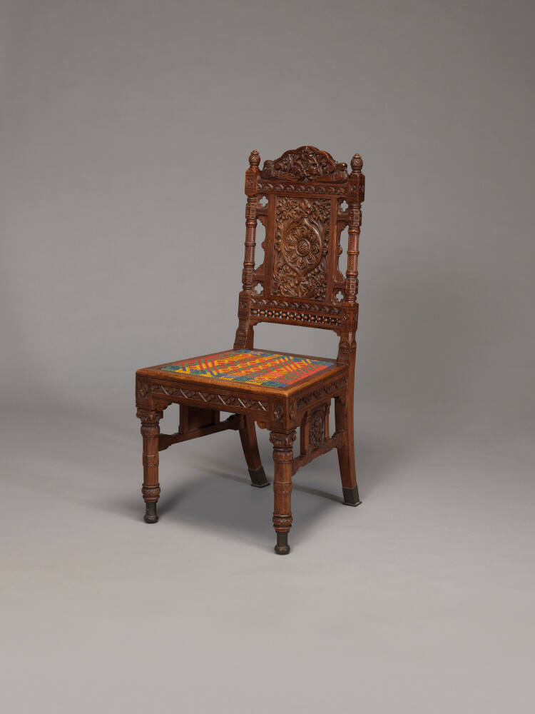 DescriptionSide chair of intricately carved wood with floral motifs on the chair back, sides and front legs. With a carved back of a lotus flower. The crestrail with a central horned mask flanked by seated birds. The legs of the chair are capped with brass, while the seat retains its intricately woven cotton string seat.Gallery LabelMade in Lahore (now part of Pakistan), this chair incorporates Indian motifs—a central lotus flower on the back and stylized birds on the crest rail—and the traditional form of an English chair of the early 1800s. The chair is shown with a new woven seat that reproduces the pattern and colors of the original. This chair was a collaboration between designers Bhai Ram Singh and John Lockwood Kipling, the principal of the Mayo School of Arts in Lahore. Kipling’s life and work in India during the British Raj informed his son Rudyard Kipling, author of The Jungle Book.