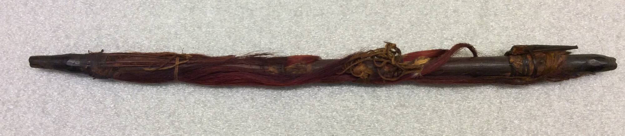 DescriptionWooden stem, blackened by fire or smoke with various attachments including feathers, wood pecker scalps (one with a beak), red-dyed horsehair and native cordagePublished ReferencesTorrence, Gaylord, ed. Continuum: North American Native Art at the Nelson-Atkins Museum of Art. Kansas City: Nelson-Atkins Museum of Art.