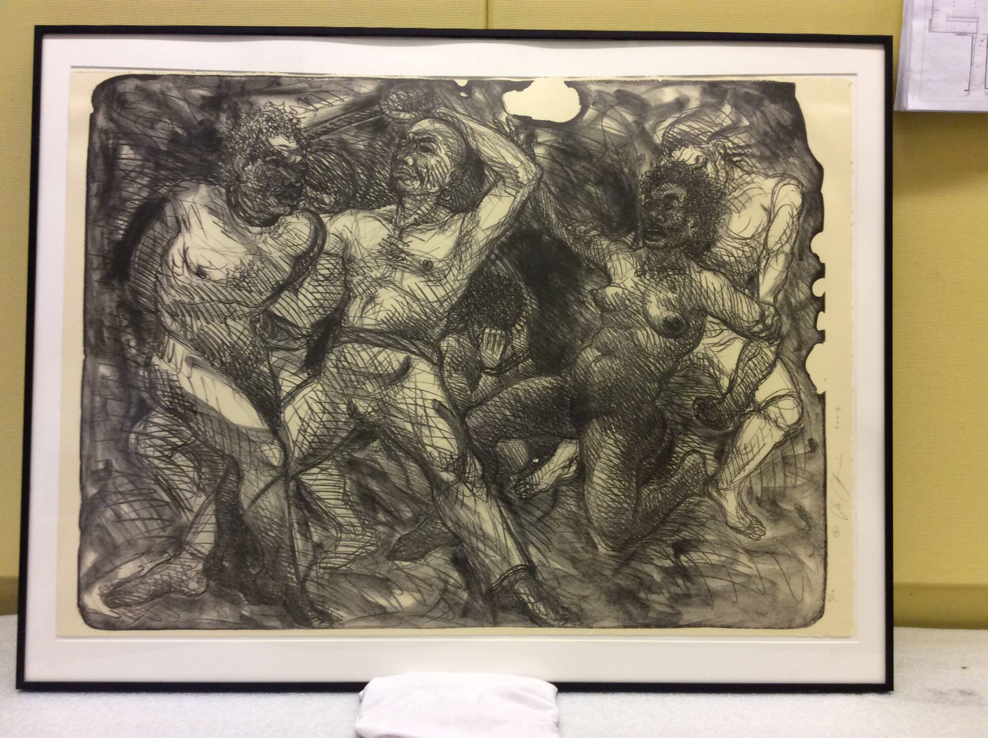 DescriptionFive figures in all, 1 with bird-like face at left next to male figure, female figure at rt with figure behind her and head of another in center kneeling, all in motion in black on tan paper.