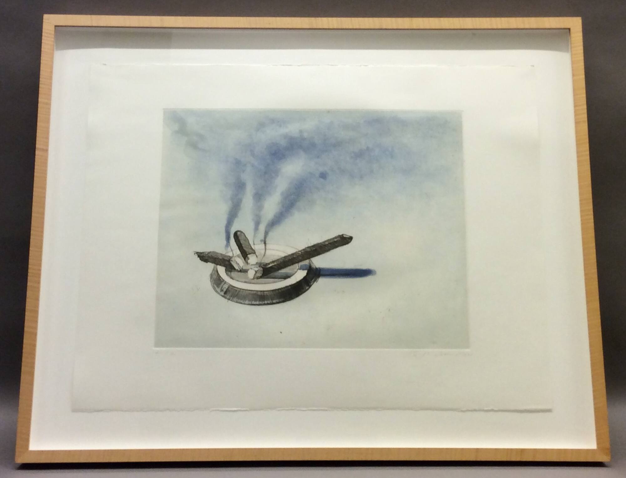Description3 burning cigars sitting in a round ashtray with bluish smoke lifting into the airCopyright© Wayne Thiebaud / Licensed by VAGA at Artists Rights Society (ARS), New York