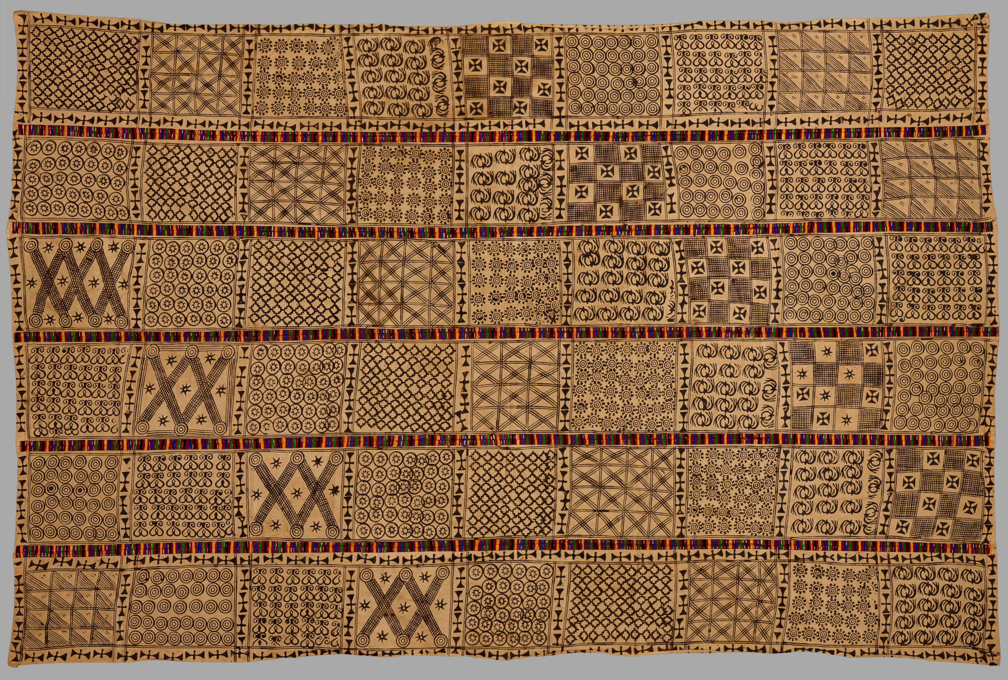 DescriptionThe cloth is a large pinkish-yellow fabric with black and brown patterns printed on it. It is composed by joining together several long, one-foot-wide strips edge-to-edge employing a distinctive embroidery technique that uses colored threads. Against the background are several stamped motifs arranged in squares, also created with the stamps. The end-design is grid-like. During pre-colonial times, Adinkra cloths, as such cloths were called, were mainly associated with funerals. The term adinkra, “to give message”, meant that the Asante intended the cloth’s stamped motifs as message bearers; indeed each different motif had a specific meaning, so a finished cloth could be inscribed with multiple messages--personal, political, and philosophical. The expectation was that the deceased would carry the messages to relatives who have long departed.ProvenanceWith John Akwasi Adu Agyei, Kenteland Enterprise, Accra, Ghana, 1995-2015 [1];