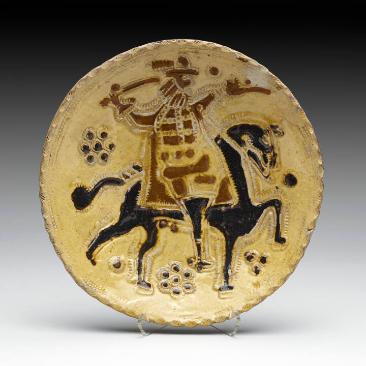 Gallery LabelThis dish was formed by rolling out a thin slab of clay and pressing it onto a convex mold incised with the equestrian cavalier design. When the clay was sufficiently dry, the edge was crimped with a cockle shell. A light slip was swirled on the inside of the dish. The incised lines of the convex mold resulted in raised relief lines of the cavalier on the face of the dish, which were filled with brown slip.