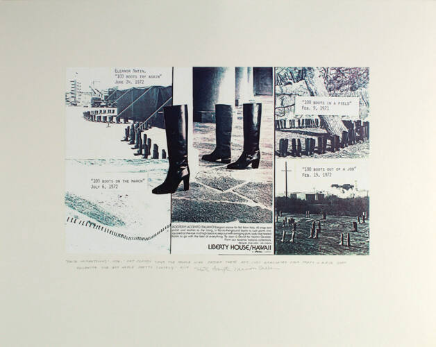 DescriptionImage of a designer boot advertisement composed of Eleanor Antin's boot photographs with titles and dates printed on them.Copyright© The Frampton Estate / Will Faller