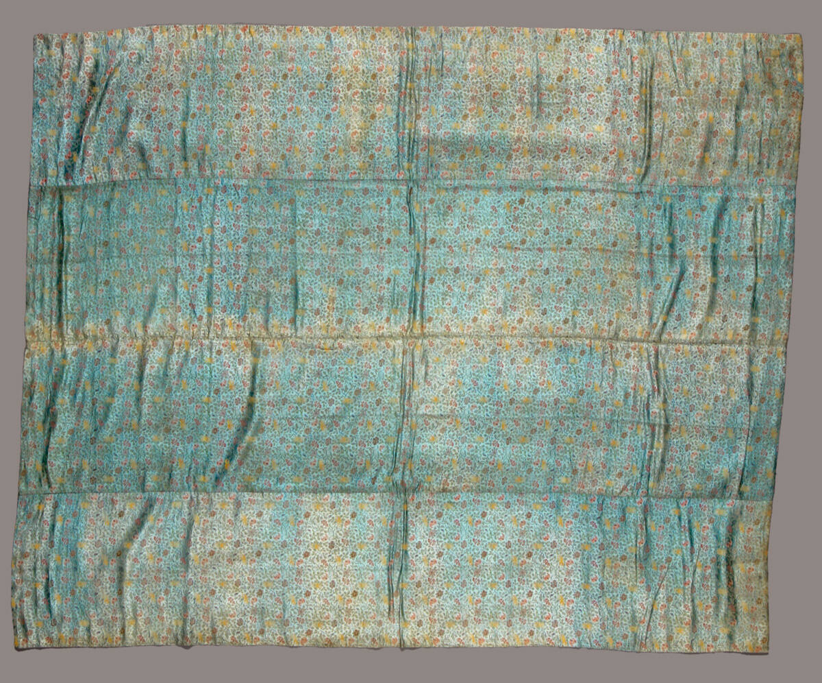 DescriptionPolychrome all-over pattern of Buddha fingers, flowers and bats on light blue satin ground. Modern silk lining.