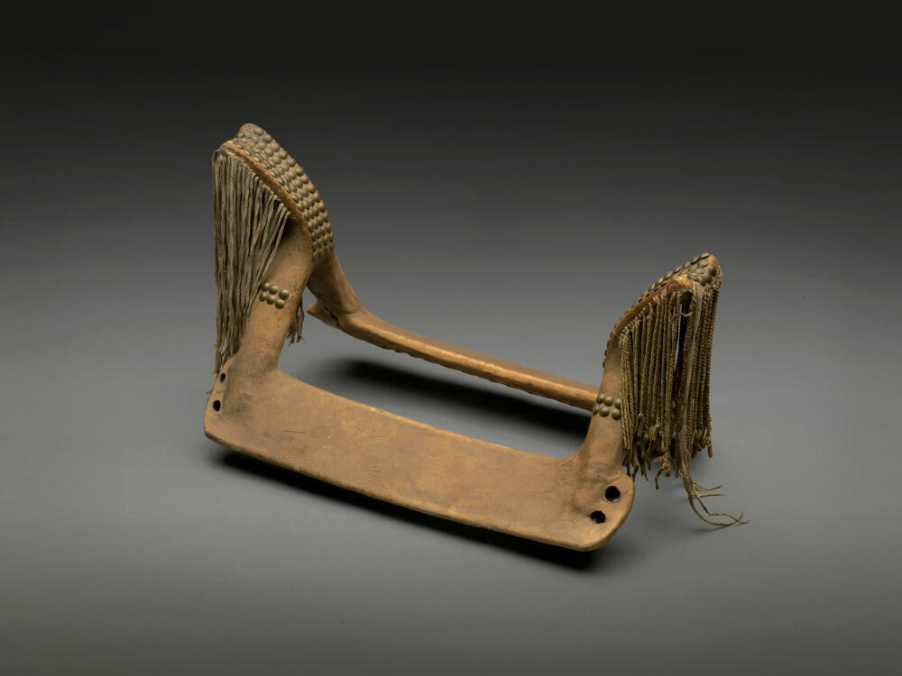 DescriptionSaddle frame made of a wood covered with rawhide with pommels covered in brass tacks and twisted native leather fringe.Published ReferencesTorrence, Gaylord, ed. Continuum: North American Native Art at the Nelson-Atkins Museum of Art. Kansas City: Nelson-Atkins Museum of Art.
